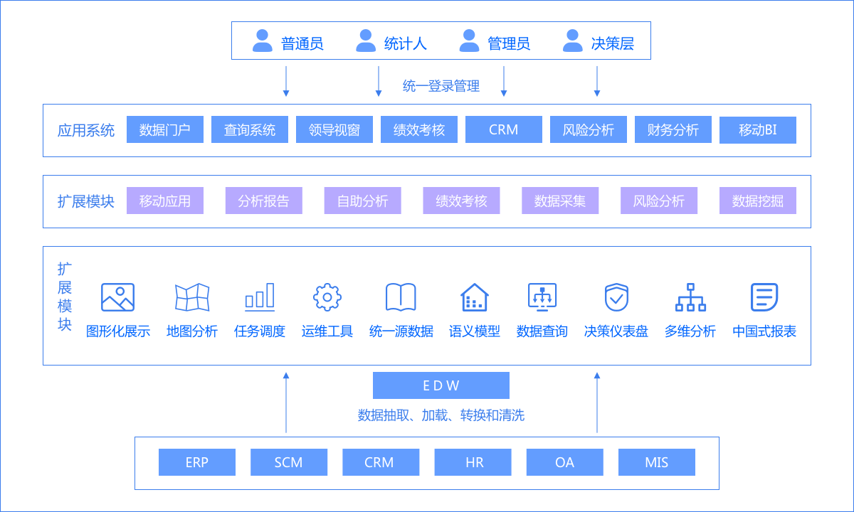 明发体育(集团)股份有限公司大数据解决方案打造了易使用、高性能、低成本、高可靠的解决方案,帮助客户进行大数据运营,挖掘出蕴含在数据当中的价值。底层计算引擎提供海量数据存储和高速计算能力;中层大数据工作台为数据资产的开发、管理、挖掘、服务化提供工具;上层应用通过各种形式发挥数据的价值。